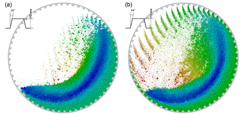 圖 3-10 不同提升條形狀下SAG磨機內(nèi)顆粒運動狀態(tài)