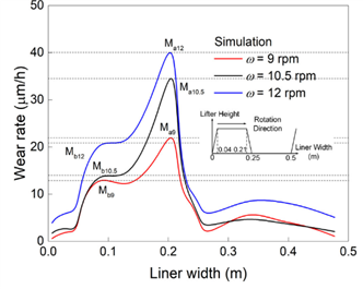 本案例采用DEMSLab軟件和內(nèi)置的侵蝕模型來預測SAG磨機內(nèi)部磨損。根據(jù)相應(yīng)的實驗數(shù)據(jù)定量驗證了標準情況下(轉(zhuǎn)速為10.5 rpm;提升桿面的角度為14°;提升桿高度為152 mm)的仿真結(jié)果。通過對比仿真結(jié)果與實驗基本吻合,表明該方法的準確性可以很好地預測SAG軋機內(nèi)的磨損。然后分別研究了旋轉(zhuǎn)速度、提升條的形狀等因素對磨損的影響,發(fā)現(xiàn)旋轉(zhuǎn)速度對SAG磨機內(nèi)襯板的磨損有重大影響,同時提升條的形狀也會對SAG磨機內(nèi)襯的磨損產(chǎn)生影響,另外轉(zhuǎn)速會影響趾部區(qū)域內(nèi)礦石顆粒的尺寸分布,這對磨損分布也有重要影響。