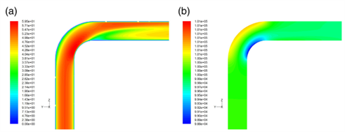 圖 2-14 Y-Z平面上的速度場和壓力場:(a)速度(m/s)和(b)壓力(Pa)