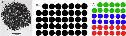 圖 3-18 (a)真實燃料顆粒樣品圖,(b)QICPIC顆粒分析儀識別獲得的顆粒尺寸和顆粒球形度分布,(c)DEMSlab中用超橢球顆粒建立的離散元模型