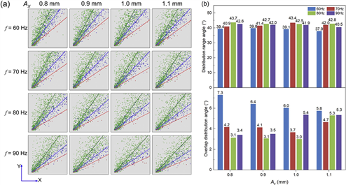 圖 3-20 a.綠色,藍色和紅色實線分別代表良性顆粒、畸形顆粒和異常顆粒的平均偏離角 b.分布范圍角和重疊分布角
