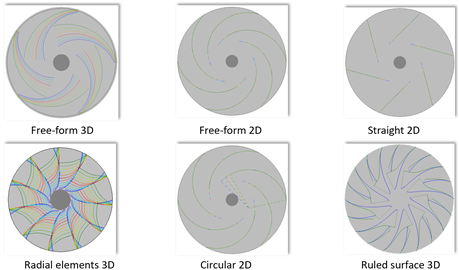 ? 葉型設(shè)計(jì)功能:CFturbo內(nèi)置有多種葉型供用戶選擇,如圓柱式、扭曲式、直紋式、直出式等,用戶可根據(jù)葉輪機(jī)械的設(shè)計(jì)要求選擇合適的葉型。軟件內(nèi)置了速度三角形設(shè)計(jì)理論和液流角設(shè)計(jì)相關(guān)的經(jīng)驗(yàn)函數(shù)指導(dǎo)設(shè)計(jì)。